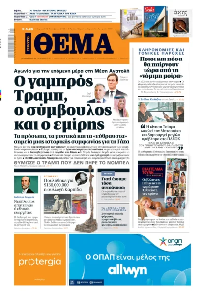 Με κεντρικό τίτλο «Ο γαμπρός Τράμπ, ο σύμβουλος και ο εμίρης» -Αγωνία για την επόμενη μέρα στη Μέση Ανατολή, κυκλοφορεί αυτή την Κυριακή 11 Οκτωβρίου 2025 το «Πρώτο Θέμα» .