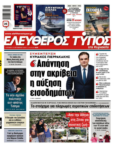 Με κεντρικό τίτλο “Απάντηση στην ακρίβεια η αύξηση εισοδημάτων” – Συνέντευξη Κυριάκος Πιερρακάκης , κυκλοφορεί αυτή την Κυριακή 11 Οκτωβρίου 2025 , ο «Ελεύθερος Τύπος» της Κυριακής