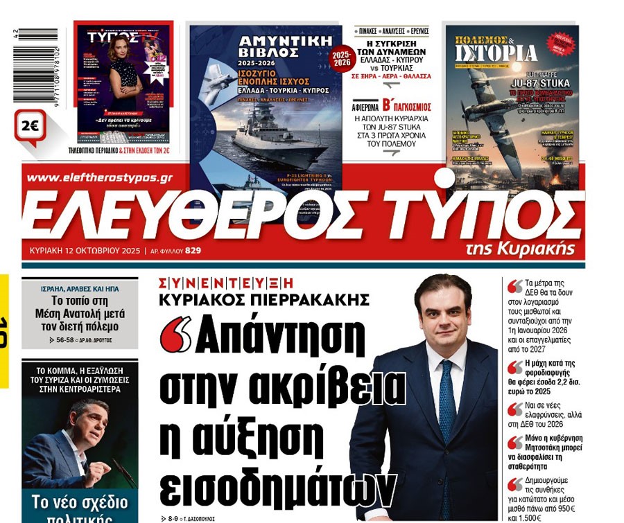 Με κεντρικό τίτλο “Απάντηση στην ακρίβεια η αύξηση εισοδημάτων” – Συνέντευξη Κυριάκος Πιερρακάκης , κυκλοφορεί αυτή την Κυριακή 11 Οκτωβρίου 2025 , ο «Ελεύθερος Τύπος» της Κυριακής