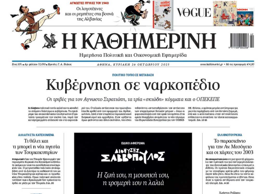 Με κεντρικό τίτλο «Κυβέρνηση σε ναρκοπέδιο – Οι τριβές για τον Αγνωστο Στρατιώτη, τα τρία «σκιώδη» κόμματα και ο ΟΠΕΚΕΠΕ», κυκλοφορεί αυτή την Κυριακή 26 Οκτωβρίου 2025 , η «Καθημερινή».