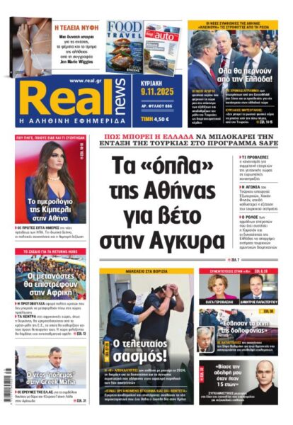 Με κεντρικό τίτλο «Τα «όπλα» της Αθήνας για βέτο στην Άγκυρα» κυκλοφορεί αυτή την Κυριακή, 9 Νοεμβρίου 2025, η «Realnews».