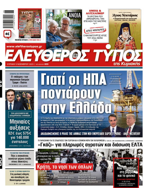 Με κεντρικό τίτλο «Γιατί οι ΗΠΑ ποντάρουν στην Ελλάδα», κυκλοφορεί αυτή την Κυριακή, 9 Νοεμβρίου 2025, ο «Ελεύθερος Τύπος».
