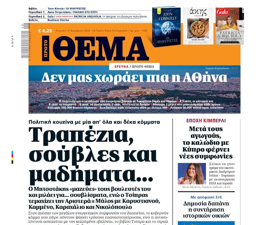 Με κεντρικό τίτλο «Τραπέζια, σούβλες και μαδήματα» – Πολίτικη κουζίνα με μια απ όλα και δέκα κόμματα, κυκλοφορεί αυτή την Κυριακή, 16 Νοεμβρίου 2025 το «Πρώτο Θέμα».