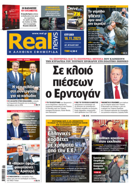 Με κεντρικό τίτλο «Σε κλοιό πιέσεων ο Ερντογάν» – Τα εσωτερικά και τα εξωτερικά μέτωπα που κλονίζουν την κυριαρχία του Τούρκου Προέδρου στο πολιτικό σκηνικό, κυκλοφορεί αυτή την Κυριακή, 16 Νοεμβρίου 2025 η «Real news».
