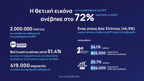 Σημειώνεται ότι οι πρόσφατες κινήσεις αναβάθμισης των ραδιοφώνων έχουν ήδη αφήσει ισχυρό αποτύπωμα. Σύμφωνα με έρευνα της Focus Bari, το 72% του κοινού διαμορφώνει θετική εικόνα για τα ραδιόφωνα της ΕΡΤ, ενώ καθημερινά περίπου 2.000.000 πολίτες συντονίζονται στους σταθμούς της. Εντυπωσιακά είναι και τα στοιχεία για το ΕΡΤnews Radio 105,8, το οποίο οι ακροατές επιβραβεύουν για την εγκυρότητα και την αξιοπιστία του σε ποσοστό 51,4%.