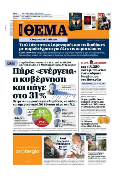 Με κεντρικό τίτλο «Πήρε «ενέργεια» η κυβέρνηση και πήγε στο 31%»- «Υπερδιπλάσιο ποσοστό η ΝΔ από το ΠΑΣΟΚ και τετραπλάσιο ο Μητσοτάκης από τον Ανδρουλάκη», κυκλοφορεί αυτή την Κυριακή το «Πρώτο Θέμα».