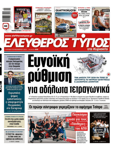 Με κεντρικό τίτλο «Ευνοϊκή ρύθμιση για αδήλωτα τετραγωνικά» κυκλοφορεί αυτή την Κυριακή, 30 Νοεμβρίου 2025, ο «Ελεύθερος Τύπος»