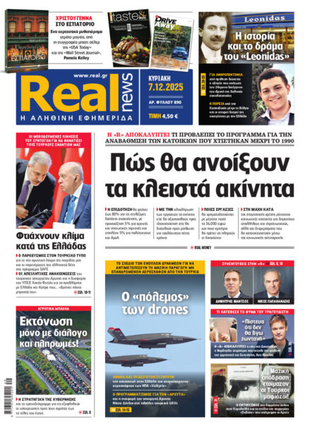Με κεντρικό τίτλο «Πώς θα ανοίξουν τα κλειστά ακίνητα» -«Τι προβλέπει το πρόγραμμα για την αναβάθμιση των κατοικιών που χτίστηκαν μέχρι το 1990», κυκλοφορεί, αυτήν την Κυριακή 7 Δεκεμβρίου 2025 η «Real news».