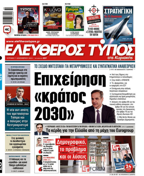 Με κεντρικό τίτλο «Επιχείρηση κράτος 2030»- Το σχέδιο Μητσοτάκη για μεταρρυθμίσεις και Συνταγματική αναθεώρηση», κυκλοφορεί αυτή την Κυριακή, 7 Δεκεμβρίου 2025 ο «Ελεύθερος Τύπος».