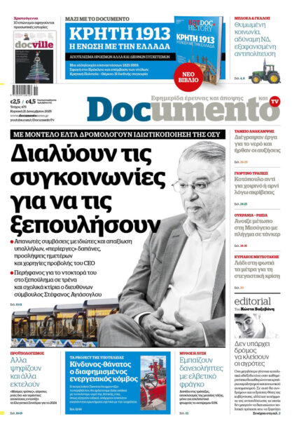 Με κεντρικό τίτλο, «Διαλύουν τις συγκοινωνίες για να τις ξεπουλήσουν» – «Με μοντέλο ΕΛΤΑ δρομολογούν ιδιωτικοποίηση της ΟΣΥ», κυκλοφορεί αυτή την Κυριακή, 21 Δεκεμβρίου, το «Documento».