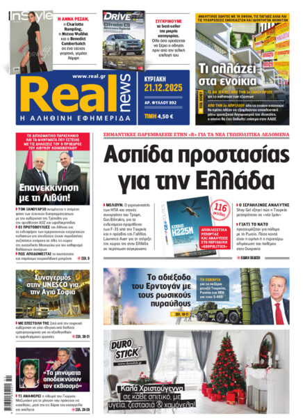 Με κεντρικό τίτλο «Ασπίδα προστασίας για την Ελλάδα» – «Σημαντικές παρεμβάσεις στην «R» για τα νέα γεωπολιτικά δεδομένα», κυκλοφορεί αυτή την Κυριακή, 21 Δεκεμβρίου 2025, η «Real news».