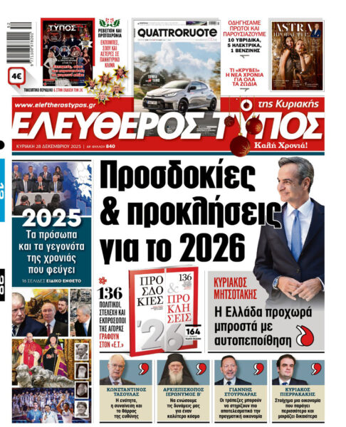 Με κεντρικό τίτλο «Προσδοκίες και προκλήσεις για το 2026», κυκλοφορεί αυτή την Κυριακή 29 Δεκεμβρίου 2025 ο «Ελεύθερος Τύπος».