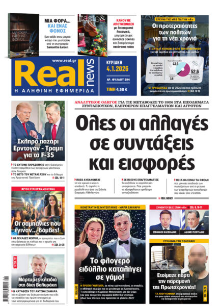 Με κεντρικό τίτλο «Ολες οι αλλαγές σε συντάξεις και εισφορές» κυκλοφορεί αυτή την Κυριακή 4 Ιανουαρίου 2026 η «Real news».