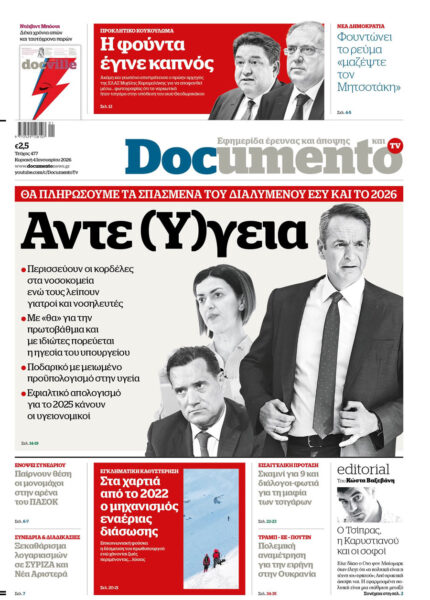 Με κεντρικό τίτλο «Θα πληρώσουμε τα σπασμένα του διαλυμένου ΕΣΥ και το 2026 – Αντε (Υ)γεια κυκλοφορεί αυτή την Κυριακή 4 Ιανουαρίου 2026 το «Documento».