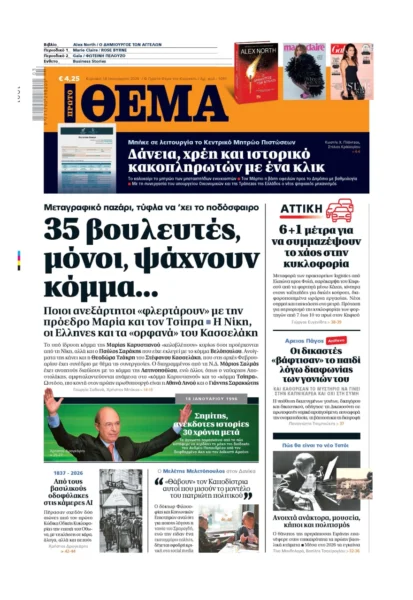 Με κεντρικό τίτλο «35 βουλευτές μόνοι, ψάχνουν κόμμα…» – «Μεταγραφικό παζάρι τύφλα να΄χει το ποδόσφαιρο», κυκλοφορεί αυτή την Κυριακή, 18 Ιανουαρίου το «Πρώτο Θέμα».