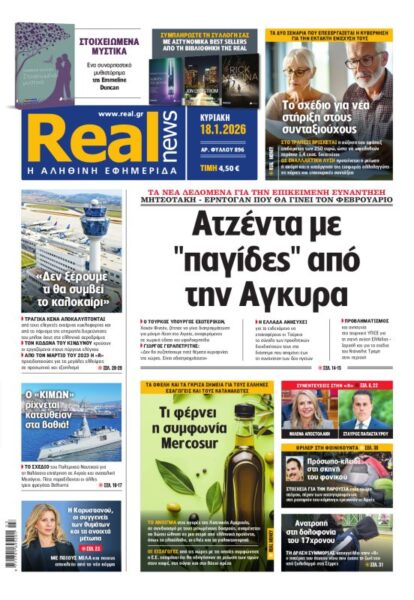Με κεντρικό τίτλο : «Ατζέντα με “παγίδες” από την Αγκυρα» – «Τα νέα δεδομένα για την επικείμενη συνάντηση Μητσοτάκη – Ερντογάν που θα γίνει τον Φεβρουάριο», κυκλοφορεί αυτή την Κυριακή, 18 Ιανουαρίου, η «Realnews».