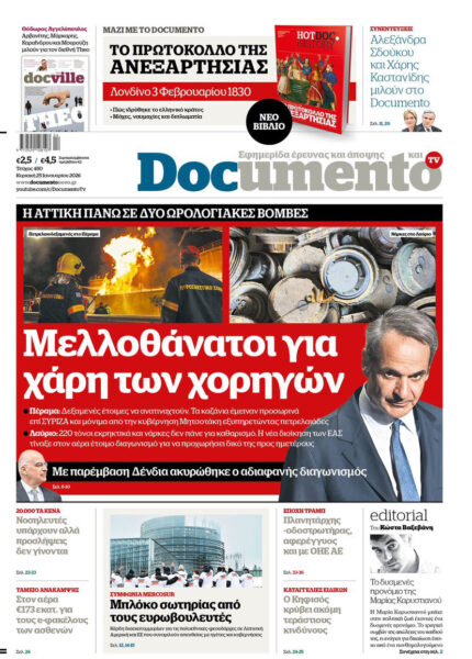 Με κεντρικό τίτλο «Μελλοθάνατοι για χάρη των χορηγών», κυκλοφορεί αυτή την Κυριακή 25 Ιανουαρίου 2026 , το «Documento».