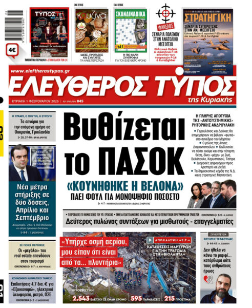 Με κεντρικό τίτλο «Βυθίζεται το ΠΑΣΟΚ» – «Κουνήθηκε η βελόνα – Πάει φουλ για μονοψήφιο ποσοστό», κυκλοφορεί αυτή την Κυριακή 1η Φεβρουαρίου 2026, ο «Ελεύθερος Τύπος».