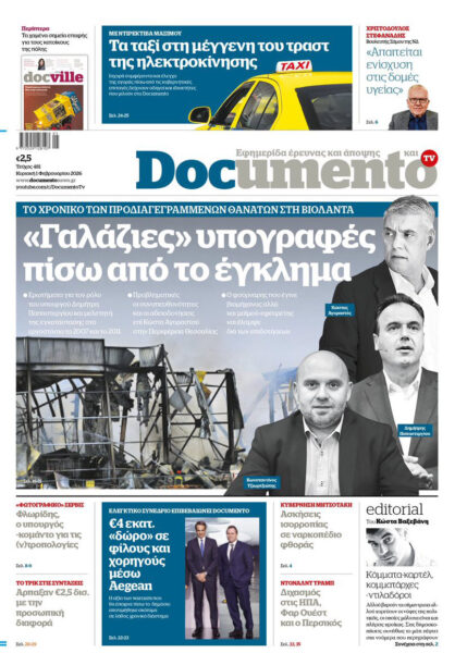 Με κεντρικό τίτλο κυκλοφορεί «Γαλάζιες υπογραφές πίσω από το έγκλημα – Το χρονικό των προδιαγεγραμμένων θανάτων στη Βιολάντα», κυκλοφορεί αυτή την Κυριακή 1η Φεβρουαρίου 2026, το «Documento».