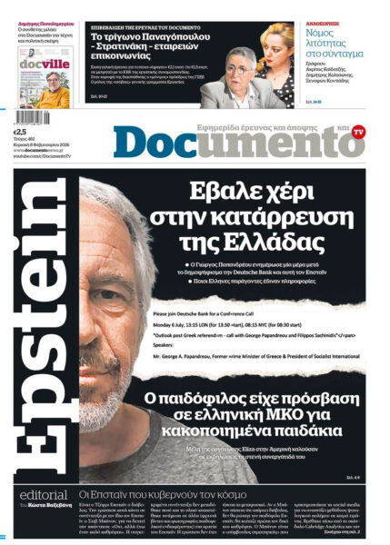 Με κεντρικό τίτλο «Επστάϊν – Έβαλε χέρι στην κατάρρευση της Ελλάδας» – «Ο παιδόφιλος είχε πρόσβαση σε ελληνική ΜΚΟ για κακοποιημένα παιδιά», κυκλοφορεί αυτή την Κυριακή 8 Φεβρουαρίου 2026, το «Documento».
