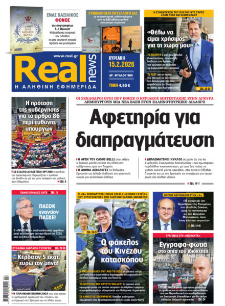 Με κεντρικό τίτλο «Αφετηρία για διαπραγμάτευση» – «Οι ξεκάθαροι όροι που έθεσε ο Κυριάκος Μητσοτάκης στην Αγκυρα δημιουργούν μία νέα βάση στον ελληνοτουρκικό διάλογο», κυκλοφορεί αυτή την Κυριακή 15 Φεβρουαρίου 2026 , η «Real news».