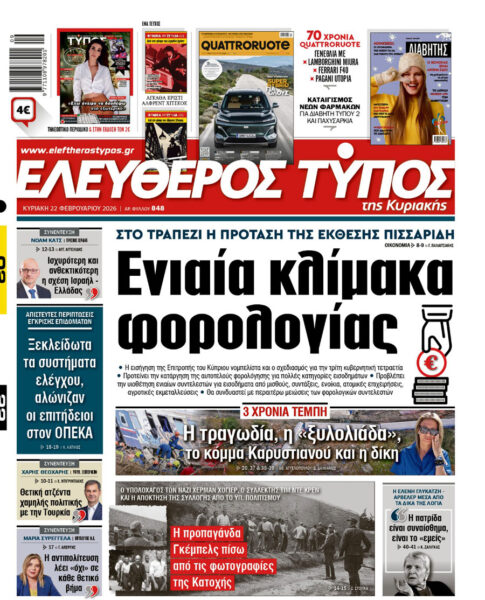 Με κεντρικό τίτλο «Ενιαία κλίμακα φορολογίας» – «Στο τραπέζι η πρόταση της έκθεσης Πισσαρίδη», κυκλοφορεί αυτή την Κυριακή 22 Φεβρουαρίου 2026, ο «Ελεύθερος Τύπος».