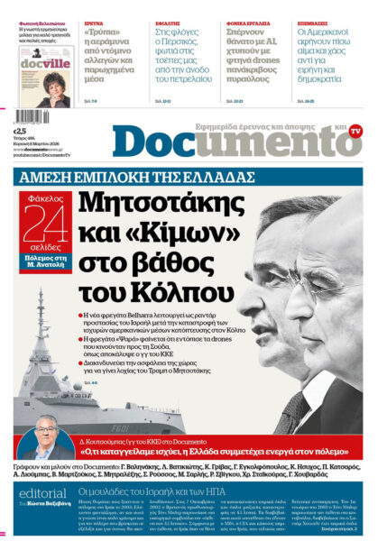 Με κεντρικό τίτλο «Μητσοτάκης και “Κίμων”στο βάθος του Κόλπου» – «Άμεση εμπλοκή της Ελλάδας» κυκλοφορεί αυτή την Κυριακή 8 Μαρτίου 2026, το «Documento».