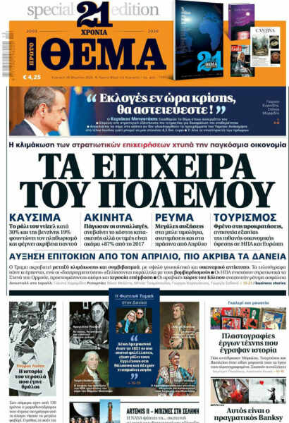 Με κεντρικό τίτλο « ΤΑ ΕΠΙΧΕΙΡΑ ΤΟΥ ΠΟΛΕΜΟΥ»- «Η κλιμάκωση των στρατιωτικών επιχειρήσεων χτυπά την παγκόσμια οικονομία», κυκλοφορεί αυτή την Κυριακή, 29 Μαρτίου, το «Πρώτο Θέμα».
