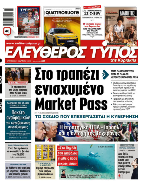 Με κεντρικό τίτλο «Στο τραπέζι ενισχυμένο Market Pass» – «Τρίτο παεκέτο μέτρων» , κυκλοφορεί αυτή την Κυριακή, 29 Μαρτίου 2026 , ο «Ελεύθερος Τύπος».