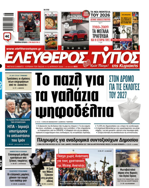 Με κεντρικό τίτλο «Το πάζλ για τα γαλάζια ψηφοδέλτια – Στο δρόμο προς τις εκλογές του 2027», κυκλοφορεί εκτάκτως το Μεγάλο Σάββατο, 11 Απριλίου 2026 , ο «Ελεύθερος Τύπος της Κυριακής».