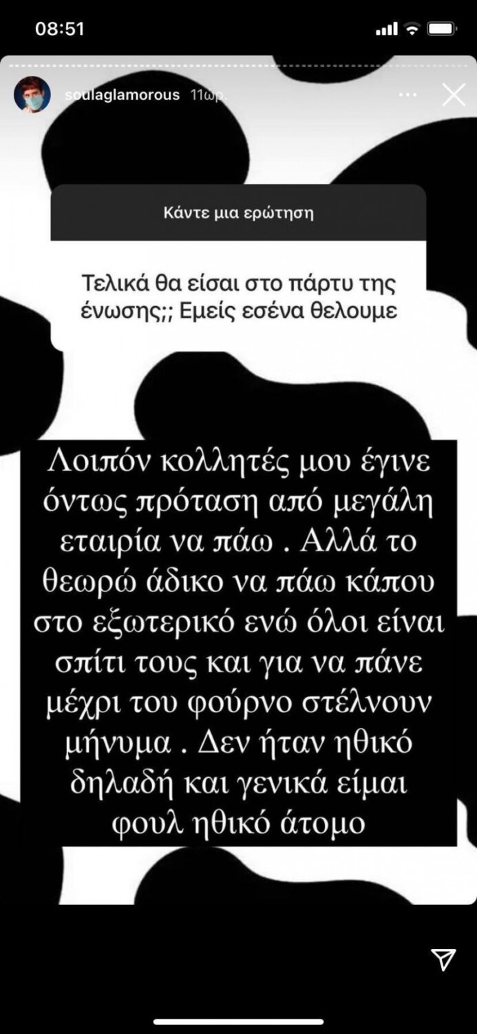 «Λοιπόν κολλητές μου έγινε όντως πρόταση από μεγάλη εταιρεία να πάω αλλά το θεωρώ άδικο να πάω κάπου στο εξωτερικό ενώ όλοι είναι σπίτι τους και για να πάνε μέχρι τον φούρνο στέλνουν μήνυμα. Δεν ήταν ηθικό δηλαδή και γενικά είμαι φουλ ηθικό άτομο» είπε με σαρκαστική, προφανώς, διάθεση…