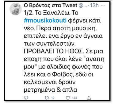 To Mουσικό Κουτί ανοίγει 2 ώρες κάθε εβδομάδα που συμπυκνώνουν όλο το DNAτης Δημόσιας τηλεόρασης που «θέλουμε και μας αξίζει» όπως ανηρτήθηκε στο Twitter με ψυχαγωγία, διασκέδαση, γνώση και διακριτική ελαφρότητα, οριακά σαν τον τριποδισμό του Χόρν όταν κατηφόριζε την Ηρώδου στην Κάλπικη Λίρα. Ούτε κραυγαλέα επιφωνήματα, ούτε επιτηδευμένο κέφι και ώπα, ούτε extra «αγάπη μουυυυυ». Το Μουσικό Κουτί κάνει και κάτι άλλο μοναδικό στην ελληνική τηλεόραση. Ανοίγει και μια μικρή πόρτα (που ελπίζουμε να μεγαλώσει του χρόνου) στην ξένη μουσική. Όταν στην ίδια εκπομπή ακούς Ακη Πάνου και GraceJonesή Radioheadκαι Διονυσίου το μόνο που οφείλεις να κάνεις είναι να βγάλεις το καπέλο σου στη μπάντα και τον κο Δίσκο που την διευθύνει. Και να ανοίξεις τα μυαλά σου τα μάτια σου και τα μάτια των άλλων να το βάλουν να το (ξανα)δούν στο ERTFLIX.