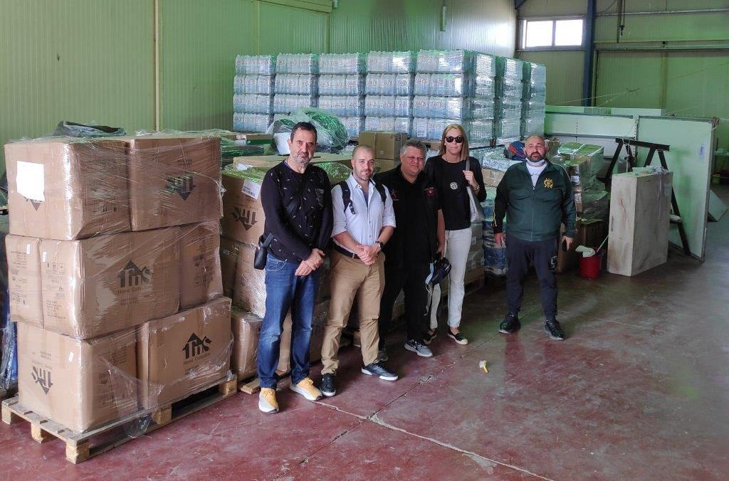 Ο πρόεδρος του Σωματείου Πρακτόρων ΟΠΑΠ Ν. Ηρακλείου, Δημήτρης Χαραλαμπάκης, και συνεργάτες του δικτύου παραδίδουν είδη πρώτης ανάγκης και υγιεινής στον Δήμαρχο Μινώα Πεδιάδας, Μανώλη Φραγκάκη.