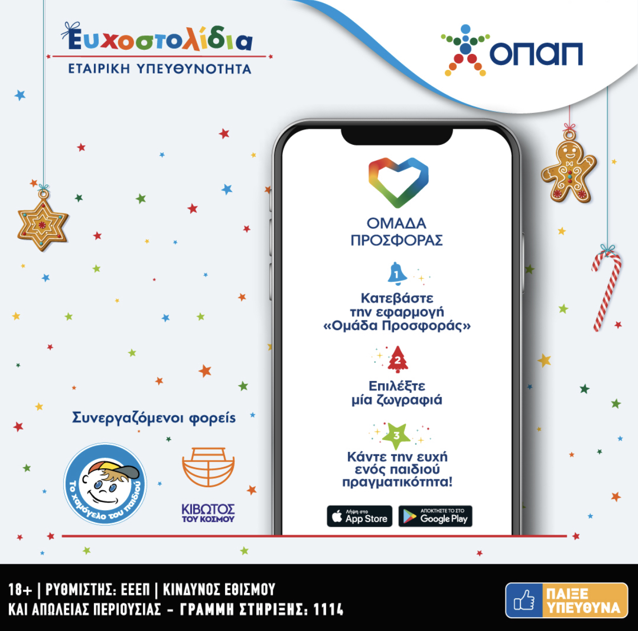 Χιλιάδες παιδιά που έχουν πραγματική ανάγκη θα δουν, για όγδοη χρονιά, τις χριστουγεννιάτικες ευχές τους να γίνονται πραγματικότητα μέσα από την πρωτοβουλία Ευχοστολίδια, που υλοποιεί ο ΟΠΑΠ. Παραμένοντας ενεργά δίπλα στην ελληνική κοινωνία και στη νέα γενιά, ο ΟΠΑΠ μας καλεί όλους να συμμετάσχουμε κι εφέτος τα Χριστούγεννα σε αυτή τη μεγάλη γιορτή προσφοράς και αγάπης, με στόχο να εκπληρωθούν οι ευχές χιλιάδων παιδιών από τους οργανισμούς «Κιβωτός του Κόσμου» και «Το Χαμόγελο του Παιδιού».