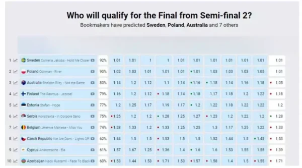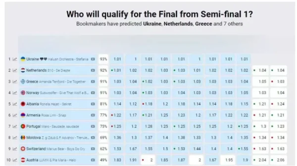 Όσον αφορά τα στοιχήματα για τον μεγάλο τελικό, εκεί η Ελλάδα βρίσκεται στην 7η θέση, ενώ η Κύπρος στην 17η.