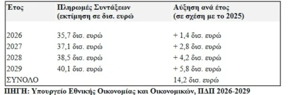 Για τους απόμαχους της εργασίας, αντίστοιχα, το κονδύλι των συντάξεων προβλέπεται να ανεβαίνει κάθε χρόνο κατά περίπου 1,4 – 1,6 δισ. ευρώ. Η συνταξιοδοτική δαπάνη αναμένεται να αυξηθεί από 34,3 δισ. ευρώ το 2025, στα 40,1 δισ. ευρώ ως το 2029.