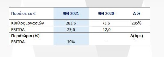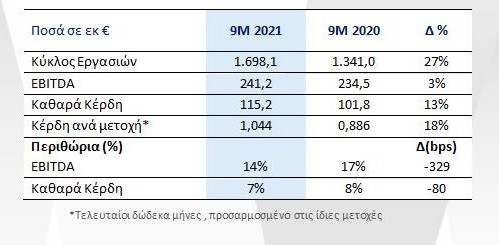 O κύκλος εργασιών διαμορφώθηκε σε €1.698,1 εκατ. έναντι €1.341,0 εκατ. το 2020, σημειώνοντας αύξηση 27%. Τα Κέρδη προ Φόρων, Τόκων και Αποσβέσεων (EBITDA) διαμορφώθηκαν στα €241,2 εκατ. έναντι €234,5 εκατ. κατά το Εννεάμηνο του 2020, επωφελούμενα από τη σημαντικά βελτιωμένη επίδοση του Τομέα Έργων Βιώσιμης Ανάπτυξης, που επανήλθε σε κερδοφορία μετά την ανάληψη νέων συμβάσεων το προηγούμενο διάστημα, αλλά και τις σταθερά ισχυρές επιδόσεις του Τομέα Μεταλλουργίας.