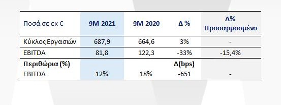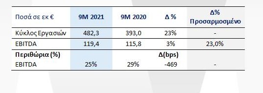 Σε μια περίοδο μεγάλων διακυμάνσεων η συγκριτική ανάλυση μεγεθών αποκτά ιδιαίτερη σημασία. Ως εκ τούτου, αξίζει να σημειωθεί ότι εξαιρουμένων των επιδράσεων μη επαναλαμβανόμενων παραγόντων, η προσαρμοσμένη αύξηση του EBITDA για το εννεάμηνο του 2021 σε σύγκριση με την αντίστοιχη περίοδο του 2020 ανέρχεται σε περίπου 23%.