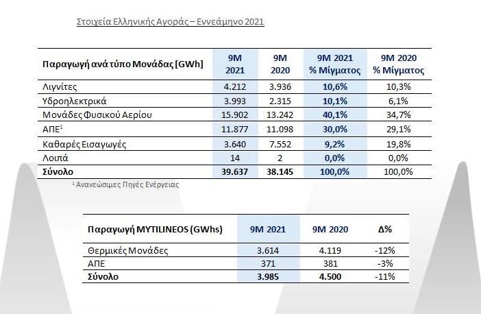 Η παραγωγή των θερμικών μονάδων της MYTILINEOS ήταν μειωμένη στις 3,6 TWh από 4,1 TWh την αντίστοιχη περσινή περίοδο, καθώς, όπως αναφέρθηκε, η Εταιρεία προχώρησε στην προγραμματισμένη τρίμηνη «Μεγάλη Συντήρηση» του σταθμού της Korinthos Power κατά το διάστημα Μαρτίου-Μαΐου 2021. Η μονάδα λειτουργεί κανονικά από τις αρχές Ιουνίου, συνεισφέροντας στην κάλυψη των ενεργειακών αναγκών της χώρας.