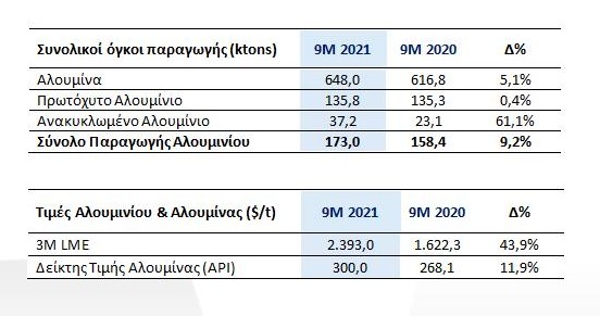 αύξηση 11,9% σε σύγκριση με το Εννεάμηνο του 2020, το τελευταίο διάστημα έχει αρχίσει να ευθυγραμμίζεται με την άνοδο των τιμών του μετάλλου.