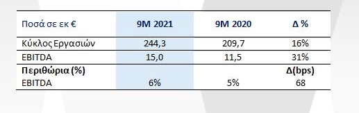 του 2020. Τα κέρδη προ φόρων τόκων και αποσβέσεων (EBITDA), διαμορφώθηκαν σε €15,0 εκατ., αυξημένα κατά 31%. έναντι €11,5 εκατ. της αντίστοιχης περιόδου το 2020.