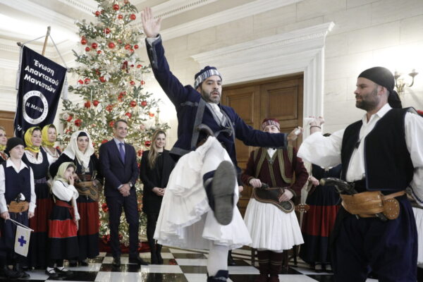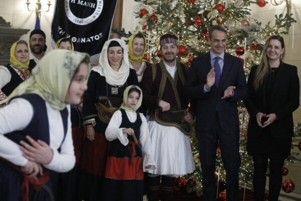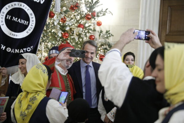 Ο Κυριάκος Μητσοτάκης μαζί με την κόρη του Σοφία άκουσε τα πρωτοχρονιάτικα κάλαντα από τα μέλη της Ένωσης Απανταχού Μανιατών «Η Μάνη»