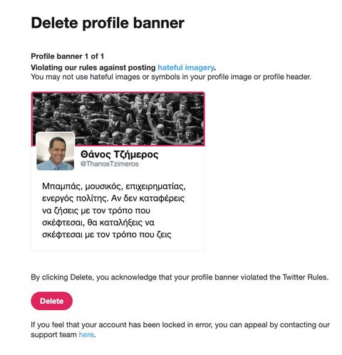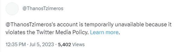 Όπως αναφέρεται στην πλατφόρμα, «Ο λογαριασμός του χρήστη @ThanosTzimeros δεν είναι διαθέσιμος προσωρινά επειδή παραβαίνει την Πολιτική πολυμέσων του Twitter».