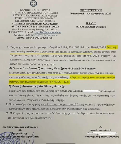 Με το πρώτο έγγραφο που επισυνάπτω, η Γενική Διεύθυνση Επίσημων και Ευπαθών Στόχων έκρινε ότι δικαιούμαι αστυνομική φύλαξη, μέχρι το πέρας των εσωκομματικών εκλογών του ΣΥΡΙΖΑ – ΠΣ, προφανώς λόγω των περιοδειών και δημόσιων εμφανίσεων που ενέχουν αυξημένο κίνδυνο.