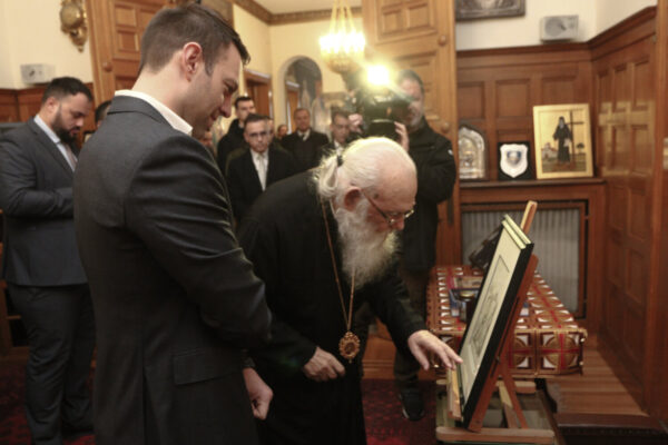 Ο Μακαριώτατος δώρισε στον κ. Κασσελάκη ένα βιβλίο, με θέμα «Η απάντηση της εκκλησίας στα μυθεύματα του αντικληρικαλιστικού λαϊκισμού», αλλά και τσίπουρο και μέλι, παραγωγής από το ησυχαστήριο του, στη Βοιωτία.