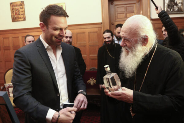 Ο Μακαριώτατος δώρισε στον κ. Κασσελάκη ένα βιβλίο, με θέμα «Η απάντηση της εκκλησίας στα μυθεύματα του αντικληρικαλιστικού λαϊκισμού», αλλά και τσίπουρο και μέλι, παραγωγής από το ησυχαστήριο του, στη Βοιωτία.