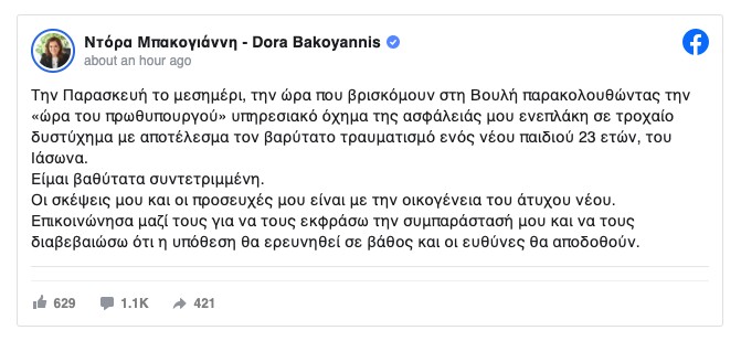 Μπακογιάννη: Όχημα της ασφάλειάς μου ενεπλάκη σε σοβαρό τροχαίο – Είμαι βαθύτατα συντετριμμένη