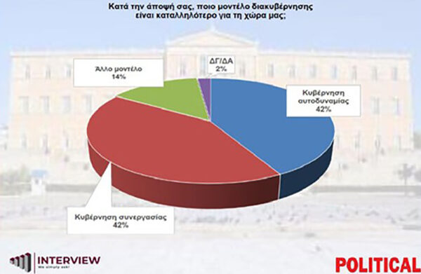 Μεγάλο ενδιαφέρον έχει και η αλλαγή που καταγράφεται πλέον στη διαχρονική άποψη των πολιτών υπέρ των αυτοδύναμων κυβερνήσεων, αφού στην ερώτηση «κατά την άποψή σας, ποιο μοντέλο διακυβέρνησης είναι καταλληλότερο για τη χώρα μας;», οι απαντήσεις δίνουν ισόποσα ποσοστά με το 42% να τάσσεται υπέρ κυβέρνησης συνεργασίας, το 42% να είναι υπέρ μιας αυτοδύναμης κυβέρνησης, το 14% υπέρ άλλου μοντέλου διακυβέρνησης και 2% «δεν ξέρω/δεν απαντώ».