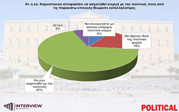 Πολύ ενδιαφέρον είναι το εύρημα που προκύπτει σε σχέση με τα σενάρια που ακούγονται περί καθόδου της Μαρίας Καρυστιανού στον πολιτικό στίβο. Συγκεκριμένα, στην ερώτηση «αν η κ. Καρυστιανού αποφασίσει να ασχοληθεί ενεργά με την πολιτική, ποια από τις παρακάτω επιλογές θεωρείτε καταλληλότερη;», το 67% απαντά «να μην ασχοληθεί με την πολιτική», έναντι 18% που απαντά «να ιδρύσει δικό της πολιτικό φορέα», 9% που θεωρεί ότι θα πρέπει να συνεργαστεί με κάποιο από τα υπάρχοντα κόμματα και 6% που απαντά «δεν ξέρω/δεν απαντώ».