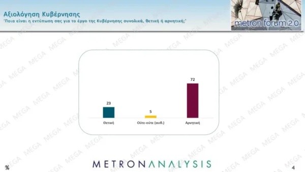 Η κυβέρνηση και ο πρωθυπουργός αξιολογούνται αρνητικά από τους πολίτες (7 στους 10) – αυξάνονται οριακά οι αρνητικές γνώμες για την κυβέρνηση και μειώνονται οριακά για τον κ. Μητσοτάκη από τον περασμένο μήνα – ενώ οι αρνητικές αξιολογήσεις για την αξιωματική αντιπολίτευση και τον κ. Ανδρουλάκη προέρχονται από τους 8 στους δέκα πολίτες.